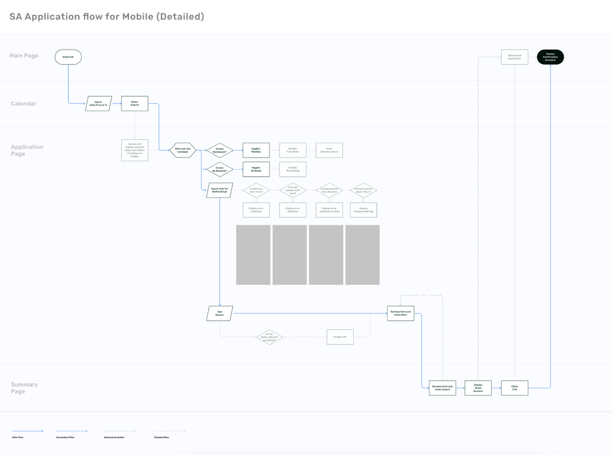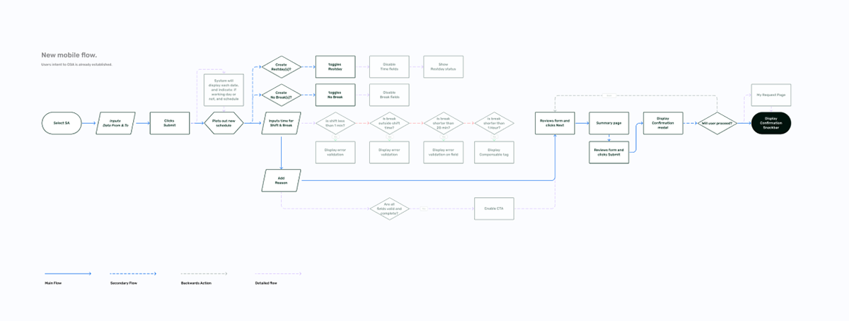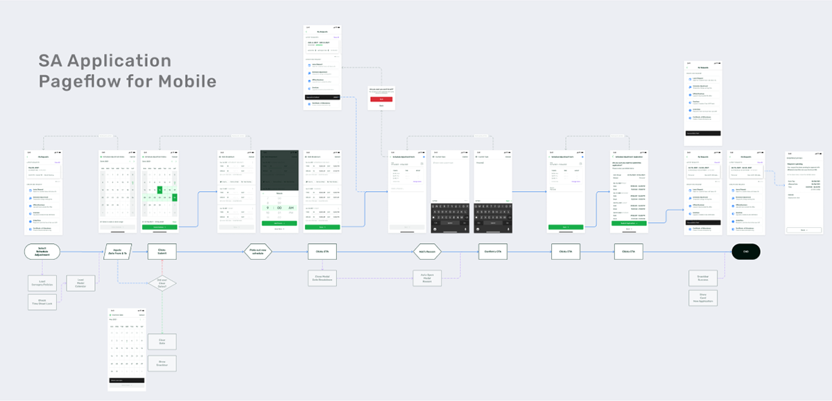 While issues like those were tagged and resolved within the internal team I also began rebuilding the overarching customer journey. Standardized across all attendance type. I began with the most complicated attendance type, based on quantity of variables and steps, the Schedule Adjustment. This meant applying the flow to latter variations were more a game of subtraction.