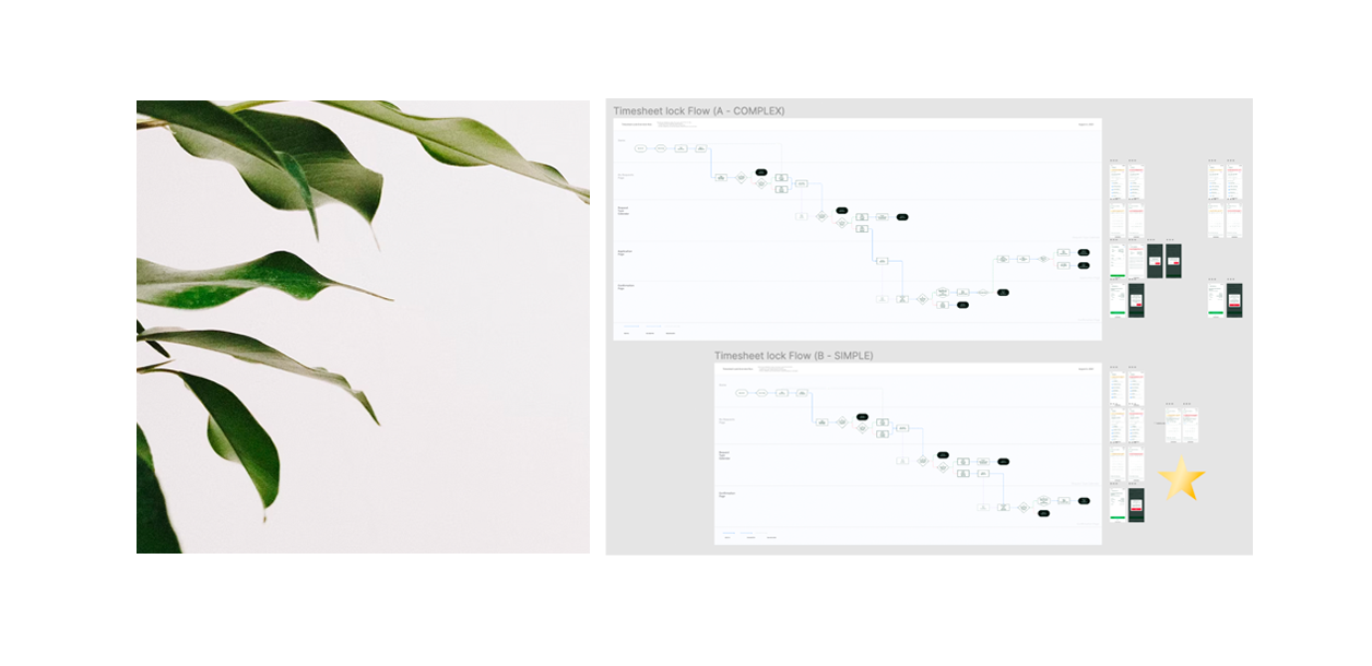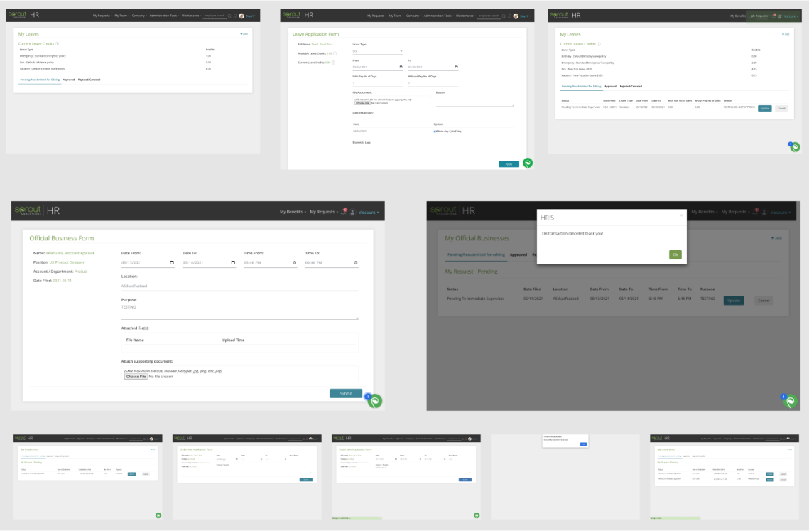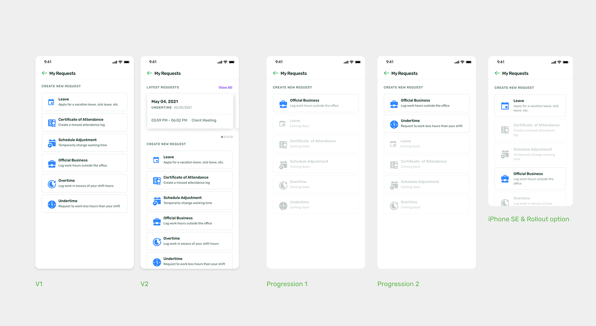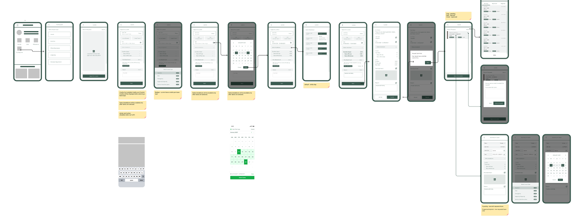 While the UX started with the 'Schedule Adjustment' Application type, the UI began with the ‘Leaves Request’ type. The flow condensed enough to display the most varied elements in a screen. Great for iterative design, and faster communication.