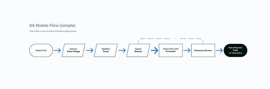 A detailed flow for filing a Schedule Adjustment for the mobile app.